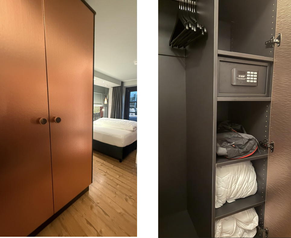왼쪽 옷장은 특별 제작 해서 만든 수공예 작품이고 안에는안에는 금고가 설치되어있다. 주변을 관광할 때 사용할 수 있는 베냥과 이불이 비취 되어 있다. (수공품인 것에 대한 존중이 높음^^)